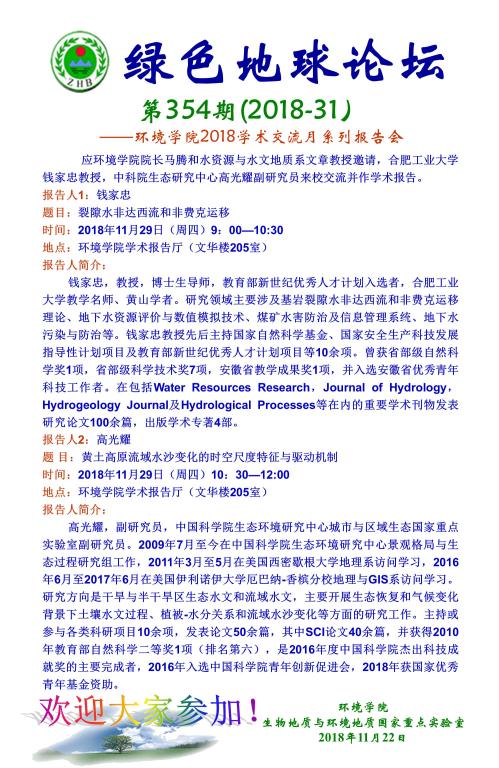 绿色地球论坛第354期(2018-31) ——无码动漫 2018学术交流月系列报告会 题目: 裂隙水非达西流和非费克运移——钱家忠 黄土高原流域水沙变化的时空尺度特征与驱动机制——高光耀 时间:2018年11月29日(周四)9:00—12:00 地点:无码动漫 学术报告厅(文华楼205室)