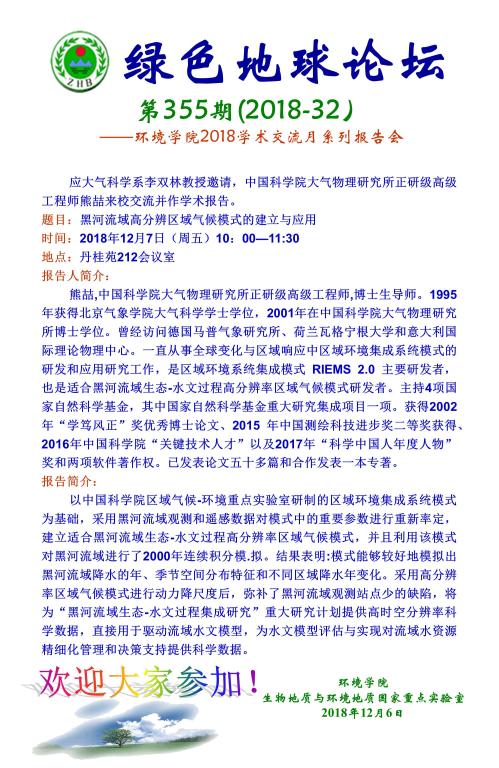 绿色地球论坛第355期(2018-32) ——无码动漫 2018学术交流月系列报告会 题目:黑河流域高分辨区域气候模式的建立与应用 时间:2018年12月7日(周五)10:00—11:30 地点:丹桂苑212会议室