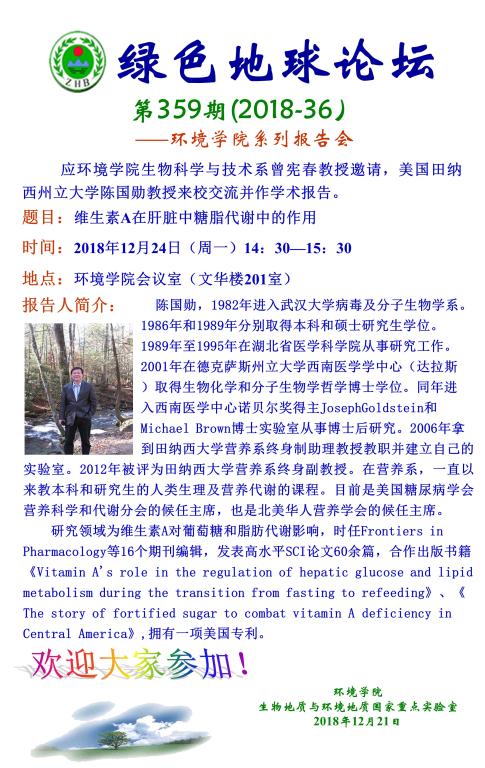 绿色地球论坛第359期(2018-36) ——无码动漫 系列学术报告会 题目:维生素A在肝脏中糖脂代谢中的作用 时间:2018年12月24日(周一)14:30 地点:无码动漫 会议室(文华楼201室)