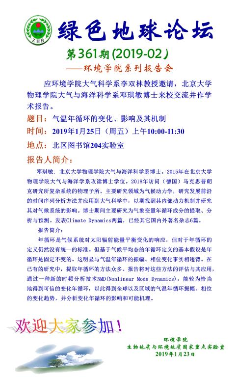 绿色地球论坛第361期(2019-02) ——无码动漫 系列学术报告会 题目:气温年循环的变化、影响及其机制 时间:2019年1月25日(周五)10:00—11:30 地点:北区图书馆204实验室