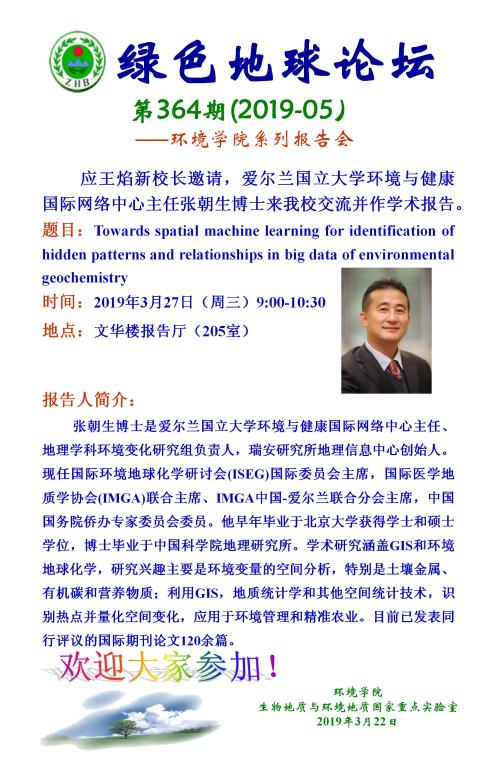 绿色地球论坛第364期(2019-05) ——无码动漫 系列学术报告会 题目:Towards spatial machine learning for identification of hidden patterns and relationships in big data of environmental geochemistry 时间:2019年3月27日(周三)上午9:00-10:30 地点:文华楼报告厅(205室)