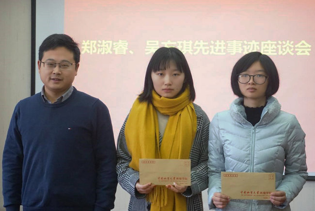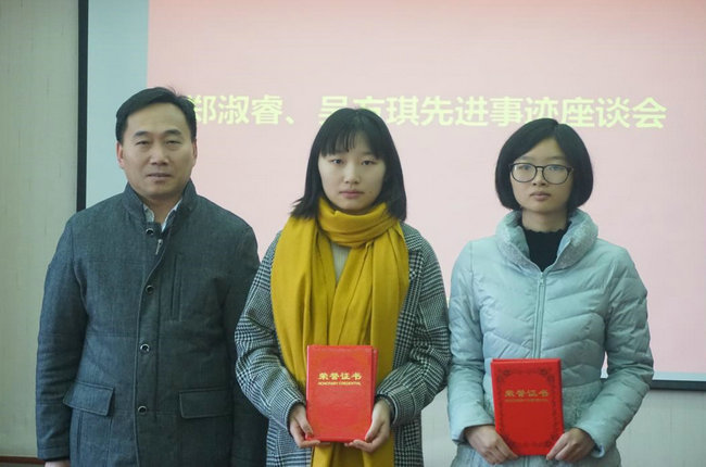 李素矿代表学院党委向郑淑睿、吴方琪颁发荣誉证书。朱继分别向两位同学颁发500元奖金。