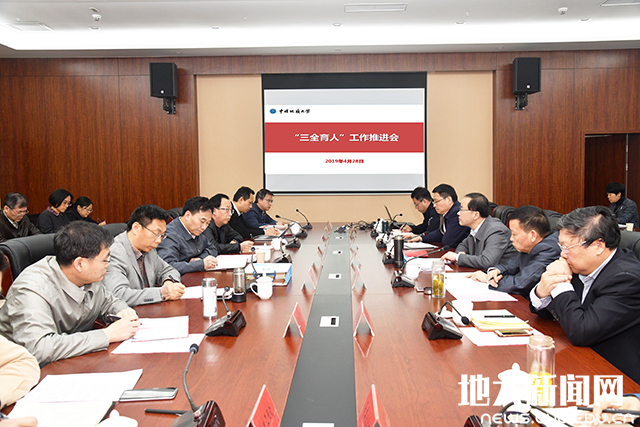(张学海摘自地大之声,通讯员霍少孟 许小康 摄影张玉贤 张学海)为深入贯彻落实全国高校思想政治工作会议、全国教育大会和学校思想政治理论课教师座谈会精神,贯彻落实教育部党组部署要求,全面推进“三全育人”综合改革,2019年4月28日,我校召开“三全育人”工作推进会。党委书记何光彩、党委副书记王林清、副校长刘杰,党委常委、组织部部长储祖旺,相关部门负责人、各学院党委书记,教师代表、学生代表参加会议。