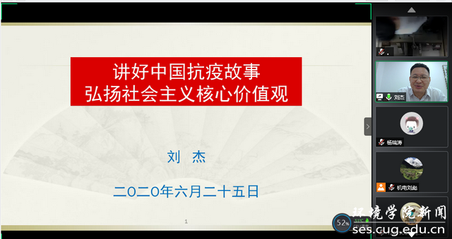 课上,刘杰围绕武汉抗疫历程、中国抗疫故事与中国力量、抗疫精神与弘扬社会主义核心价值观三个方面,详细阐述中国疫情防控取得决定性成果的原因,深刻阐明抗疫精神与弘扬社会主义核心价值观的内在关联。他指出,疫情爆发后,在以习近平同志为核心的党中央坚强领导下,迅速建立起了中央统一指挥、统一协调、统一调度的高效的指挥体系和全民参与的严密防控体系,为打赢疫情防控阻击战提供了坚实的组织保障。广大民众扛起责任,众志成城,全力支援湖北省和武汉市抗击疫情,充分体现了中华民族同舟共济、守望相助的文化底色,充分体现了中国人民深厚的家国情怀。我校师生在疫情防控过程中彰显使命和担当,为坚决打赢疫情防控阻击战贡献了地大力量。