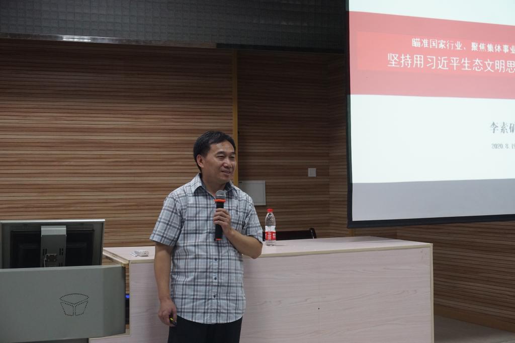 李素矿以瞄准国家行业、聚焦集体事业、规划个人职业,坚持用习近平生态文明思想定位“自己”为主题进行讲授。他从习近平生态文明思想深刻内涵、美丽中国宜居地球迈向2030、锻造培育生态环保铁军的摇篮、打造新时代合格生态环保铁军等四方面进行讲授。